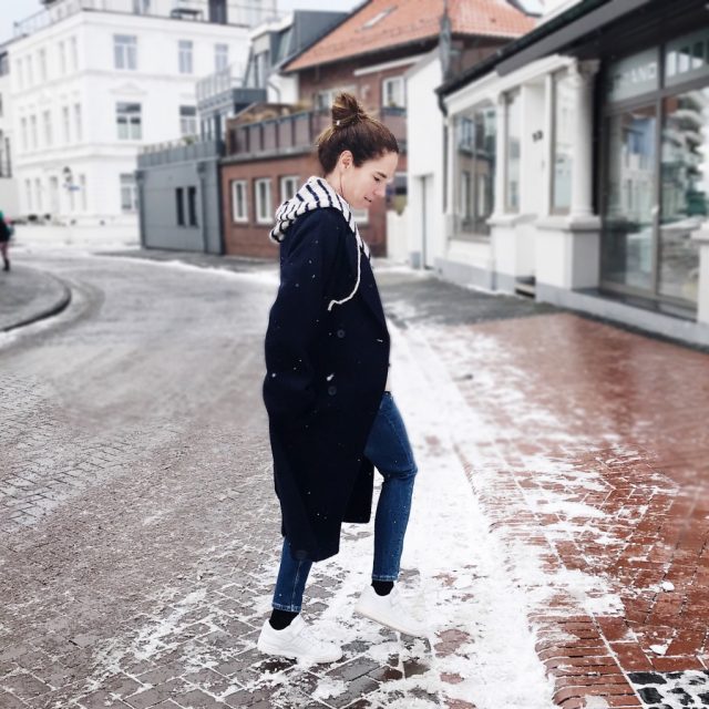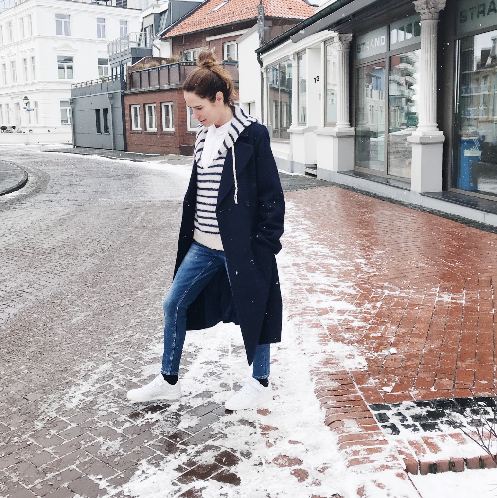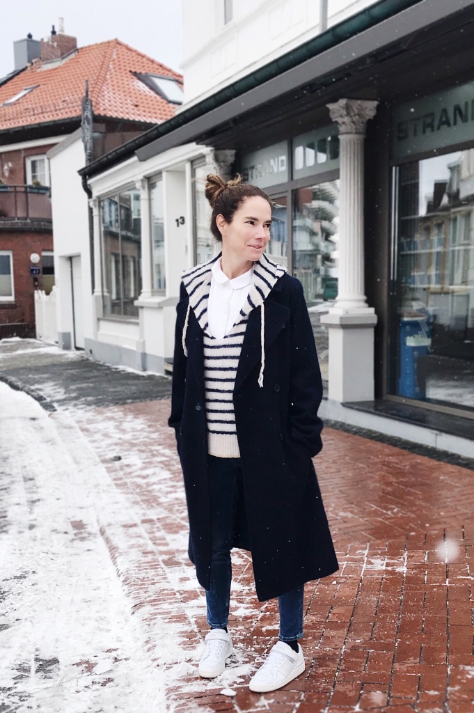 pullover und bluse von leon&harper. jeans von pepe jeans. mantel von mbym. und sneaker von adidas.
